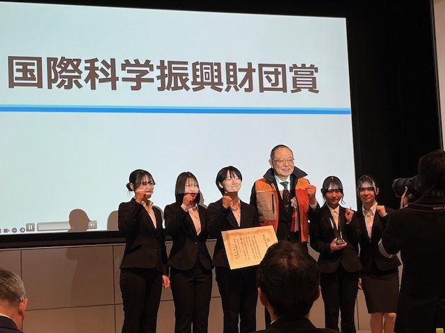 国際科学振興財団賞を受賞した福井高専チームと「ベストなベスト」を着用した吉岡高志財団専務理事